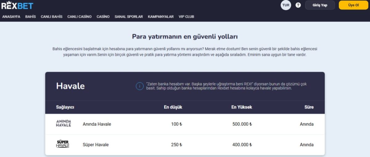 Sitede yatırım yapmak için Rexbet güncel adresi ile siteye giriş yapmanız gerekiyor. Üye girişi yaptıktan sonra hesabınıza ulaşarak para yatırma sayfasında ödeme işlemlerini tamamlayabilirsiniz. Güvenli bir şekilde yatırım yapma imkanı sunan başlıca yatırım seçenekleri şunlardır: